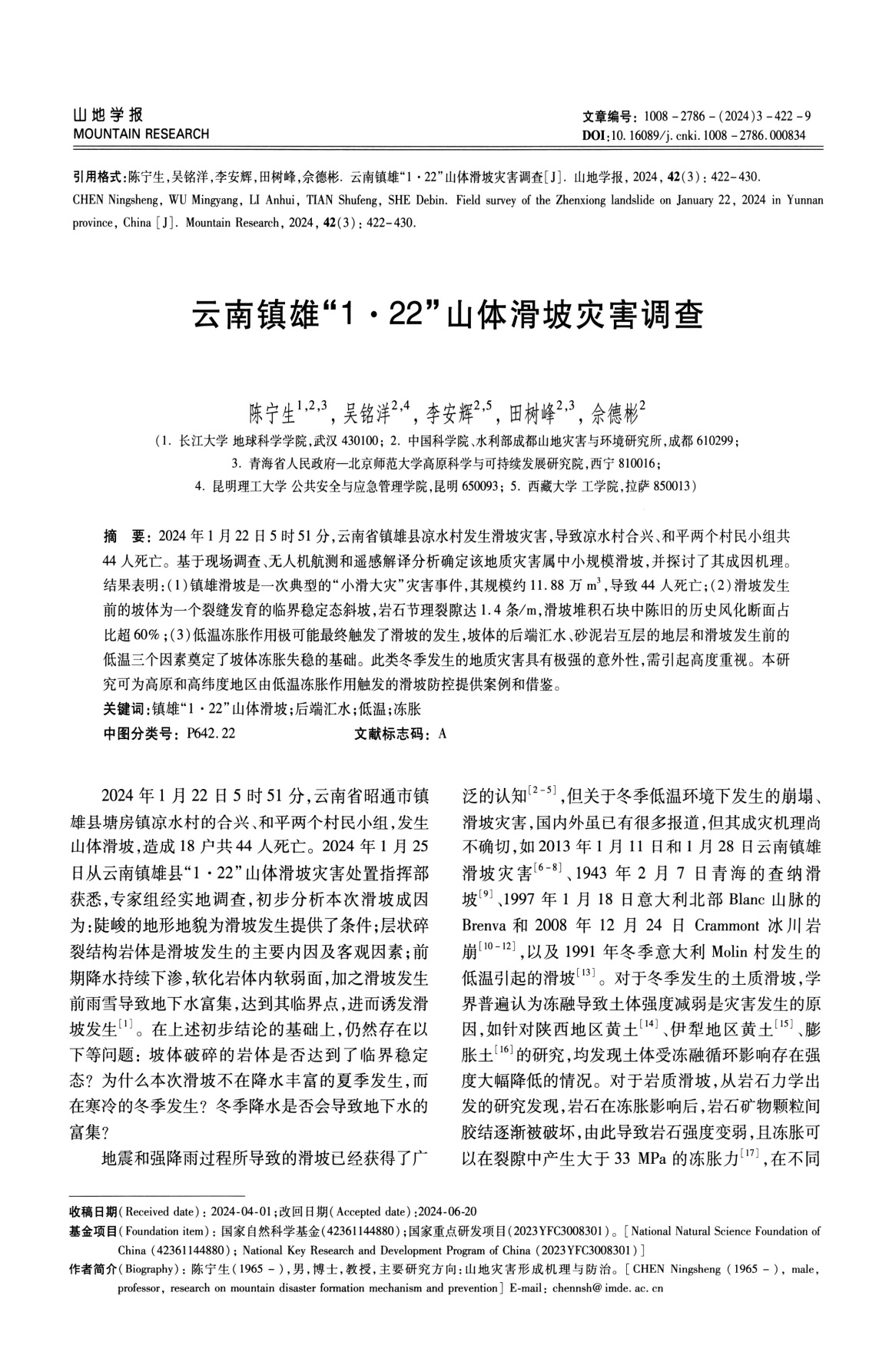 太阳成集团122ccvip陈宁生教授团队在《山地学报》上发表题为“云南镇雄‘1·22’山体滑坡灾害调查”的论文。陈宁生教授为第一作者,太阳成集团122ccvip为第一署名单位。本研究获得国家自然科学基金重点研发项目的资助。