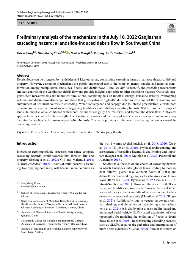 太阳成集团122ccvip陈宁生教授团队在《Bulletin of Engineering Geology and the Environment》发表了题为“Preliminary analysis of the mechanism in the July 16, 2022 Gaojiashan cascading hazard: a landslide-induced debris flow in Southwest China”的研究论文。陈宁生教授为通讯作者,太阳成集团122ccvip为第一署名单位。本研究获得国家自然科学基金重点研发项目的资助。