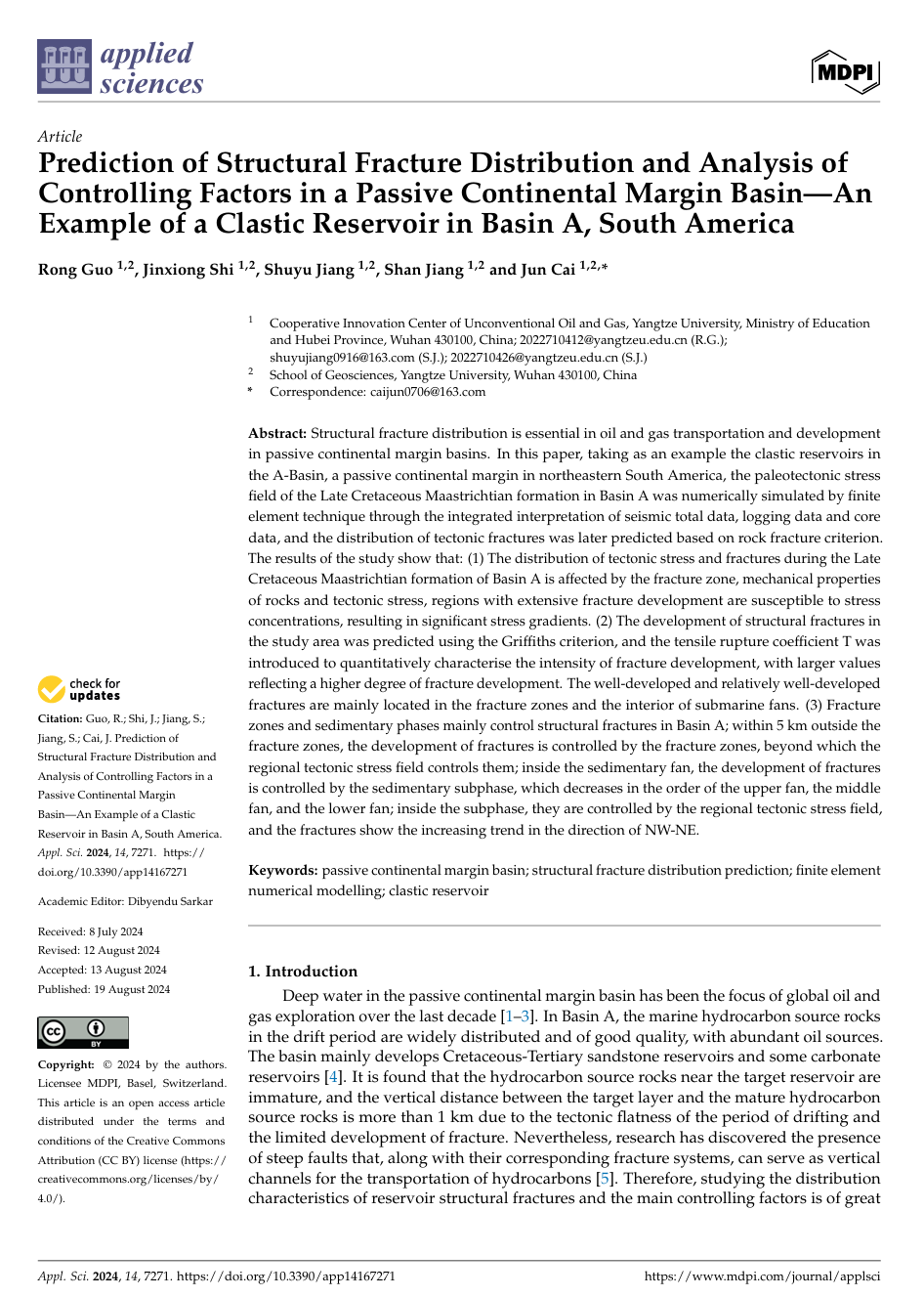 太阳成集团122ccvip硕士研究生郭蓉在《applied sciences》上发表题目为“Prediction of Structural Fracture Distribution and Analysis of Controlling Factors in a Passive Continental Margin Basin—An Example of a Clastic Reservoir in Basin A, South America”的研究论文。该研究通过采用有限元构造数值模拟技术,探讨了被动陆缘盆地的古构造应力场及其裂缝分布特征。研究结果表明被动陆缘盆地先存断裂区域容易出现应力集中,有利于裂缝发育,有效控制距离可达5公里;较大的伸展破裂系数表明被动陆缘海底扇内部也是裂缝发育的优势指向区,发育强度的差异受控于岩石力学参数的变化。
