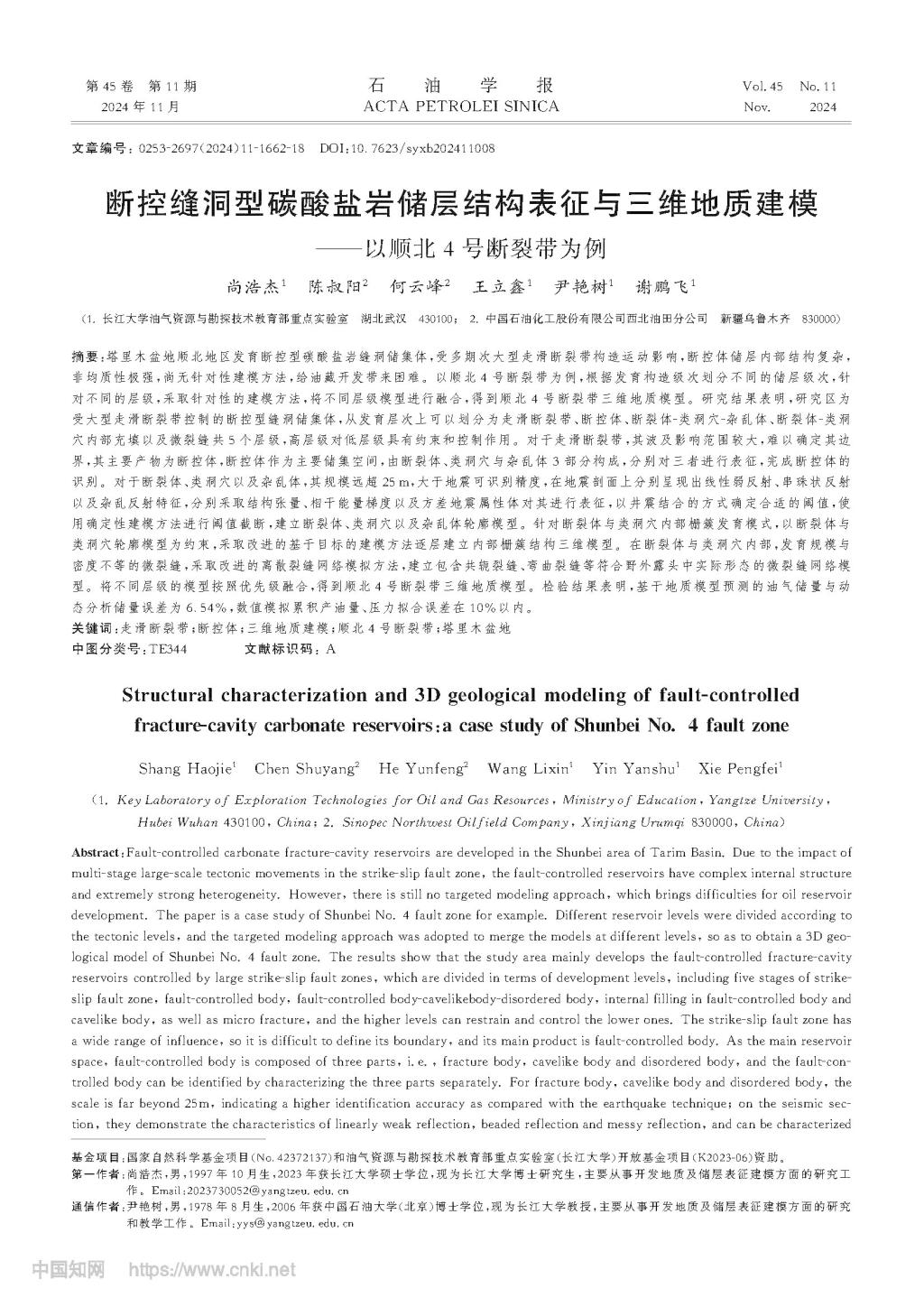 太阳成集团122ccvip博士生尚浩杰在期刊《石油学报》上发表题为“断控缝洞型碳酸盐岩储层结构表征与三维地质建模-以顺北4号断裂带为例”的研究论文。太阳成集团122ccvip油气资源与勘探技术教育部重点实验室为论文第一署名单位,尹艳树教授为通讯作者,本项研究得到国家自然科学基金项目、油气资源与勘探技术教育部重点实验室(太阳成集团122ccvip)开放基金项目共同资助。