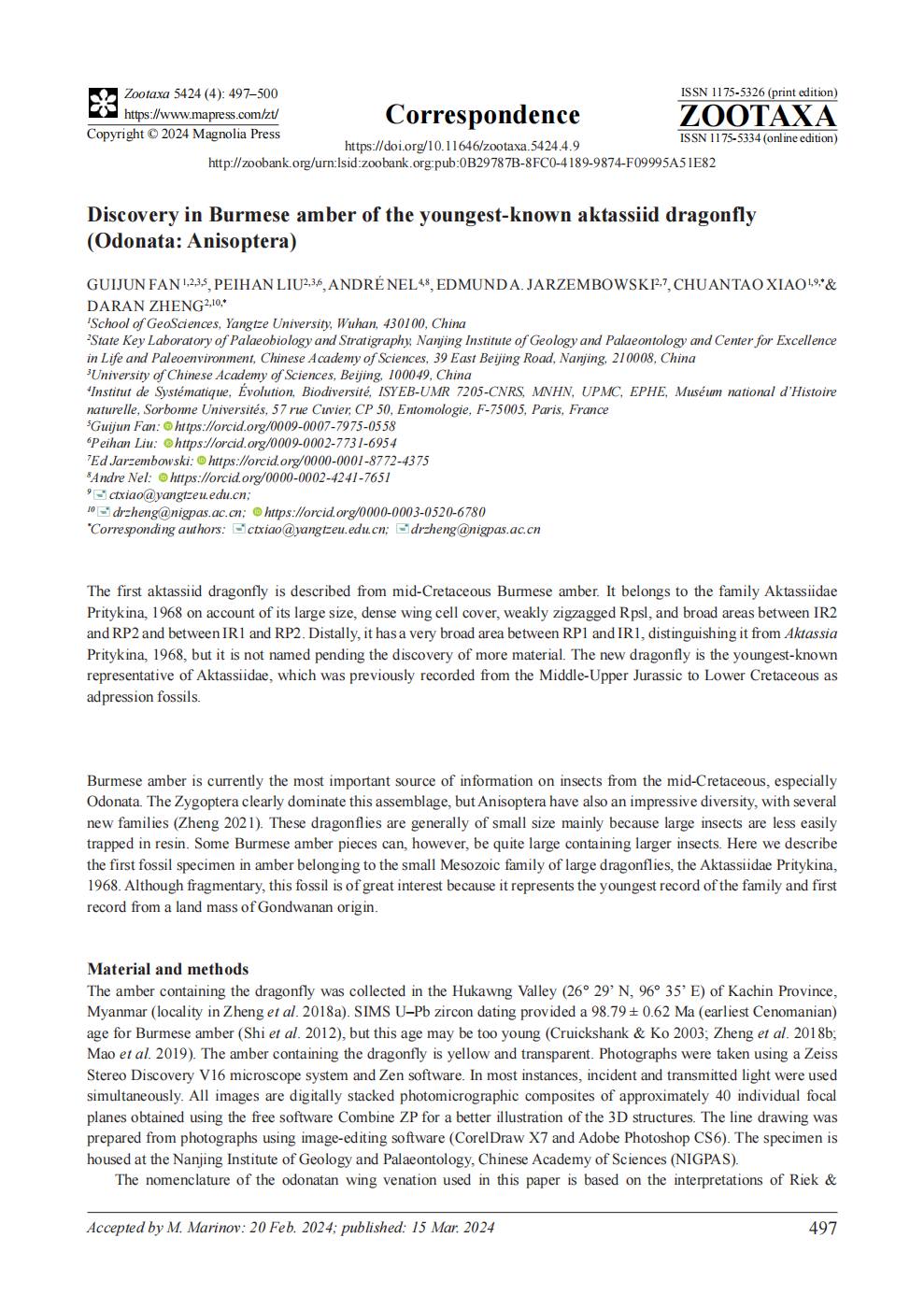 该研究选取了保存有蜻蜓目阿克塔西蜓科的琥珀化石标本为研究对象,该标本产自缅甸克钦地区胡康河谷地区,通过U-Pb锆石定年法确认其时代大致属于晚白垩世的塞诺曼阶(Cenomanian)早期。在缅甸琥珀中共报道蜻蜓目:19科,38属,47种,其中差翅亚目7科,14属,14种。由于差翅亚目体系较大,较难在琥珀中保存,并且对其翅脉进行研究,中生代仅有两个科有如此密集的翅室,衍蜓科和阿克塔西蜓科,但是由于前者拥有定义更明确的Rspl脉,因此不太可能将其定到衍蜓科中。该琥珀中的翅脉IR2与RP2和IR2与RP3/4之间的区域面积很大,与阿克塔西蜓属的模式种翅脉很相似。但是其他的阿克塔西蜓属这之间的区域面积没有那么大。因此将其暂定为阿克塔西蜓科中。它就像一个模式属的翅脉,不同于阿克塔西蜓属。但是由于太不完整,无法对其正式命名。因此此块标本也是在成千上万块缅甸琥珀中目前发现的唯一的阿克塔西蜓化石,也是阿克塔西蜓科最年轻的代表,具有十分重要的意义,之前仅被记录于中上侏罗统-下白垩统的压型化石中,在缅甸琥珀中的发现表明了该科更广泛的分布,对阿克塔西蜓的演化提供了重要的依据。