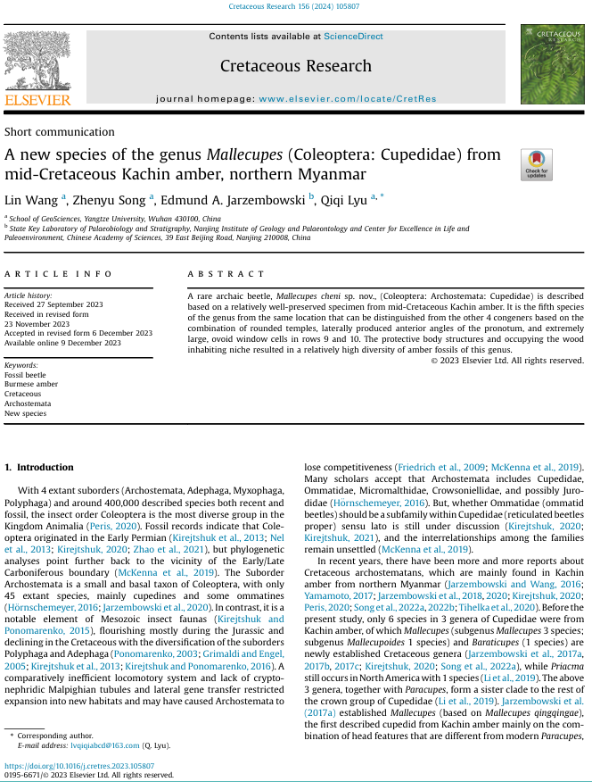 太阳成集团122ccvip硕士研究生王林同学在公司吕奇奇、宋振宇两位老师共同指导下,在地球科学与古生物学领域期刊《Cretaceous Research》上发表题为“A new species of the genusMallecupes(Coleoptera: Cupedidae) from mid-Cretaceous Kachin amber, northern Myanmar”的研究论文。