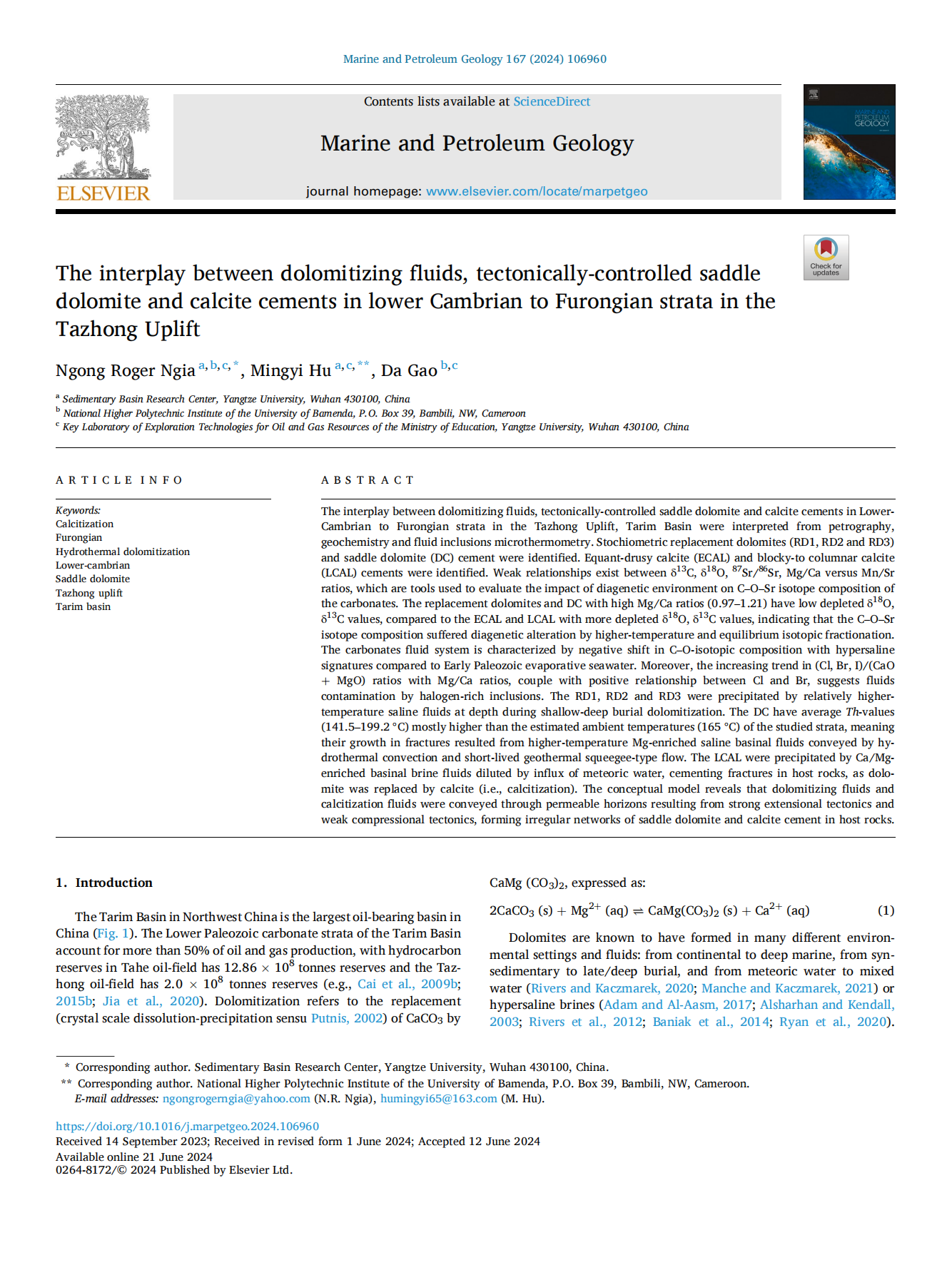 太阳成集团122ccvip胡明毅教授团队在石油地质领域主流期刊《Marine and Petroleum Geology》发表了题为“The interplay between dolomitizing fluids, tectonically-controlled saddle dolomite and calcite cements in lower Cambrian to Furongian strata in the Tazhong Uplift”的研究论文。