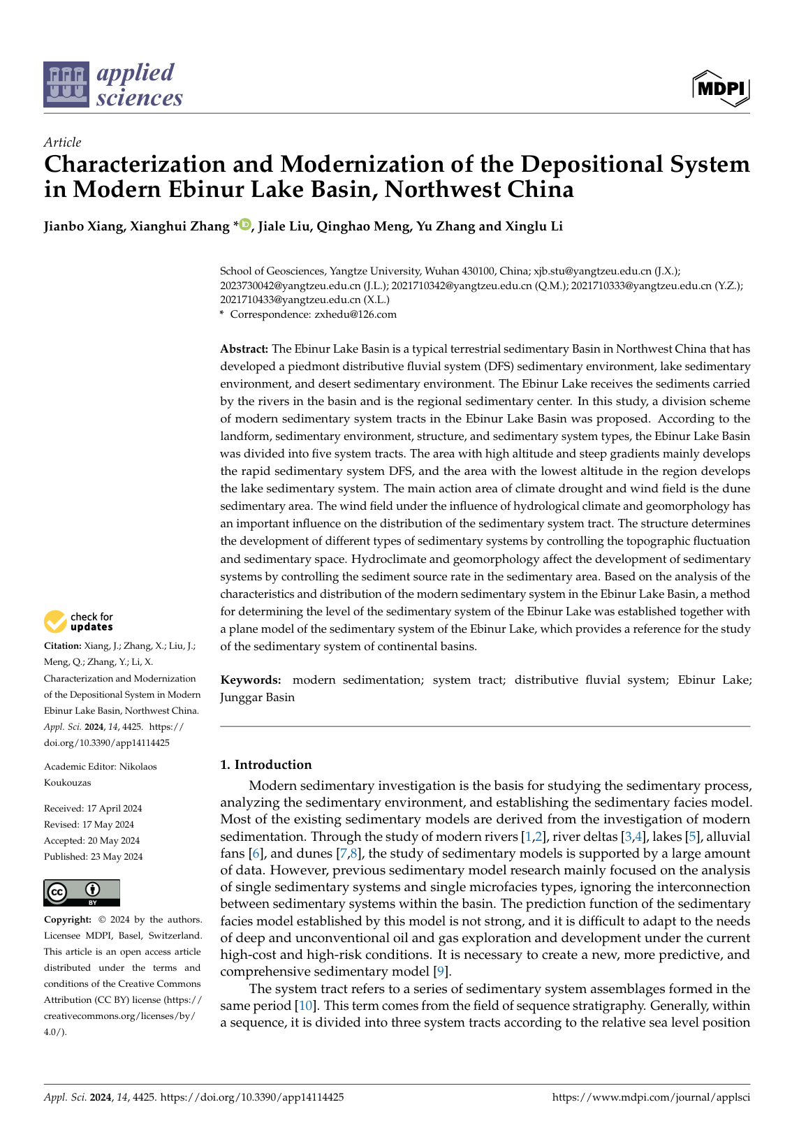 太阳成集团122ccvip硕士生向建波在期刊《applied sciences》上发表题为“Characterization and Modernization of the Depositional System in Modern Ebinur Lake Basin, Northwest China”的研究论文。太阳成集团122ccvip为论文第一署名单位,张祥辉博士为第一通讯作者,本项研究得到国家自然科学基金重点项目、湖北省自然科学基金项目共同资助。