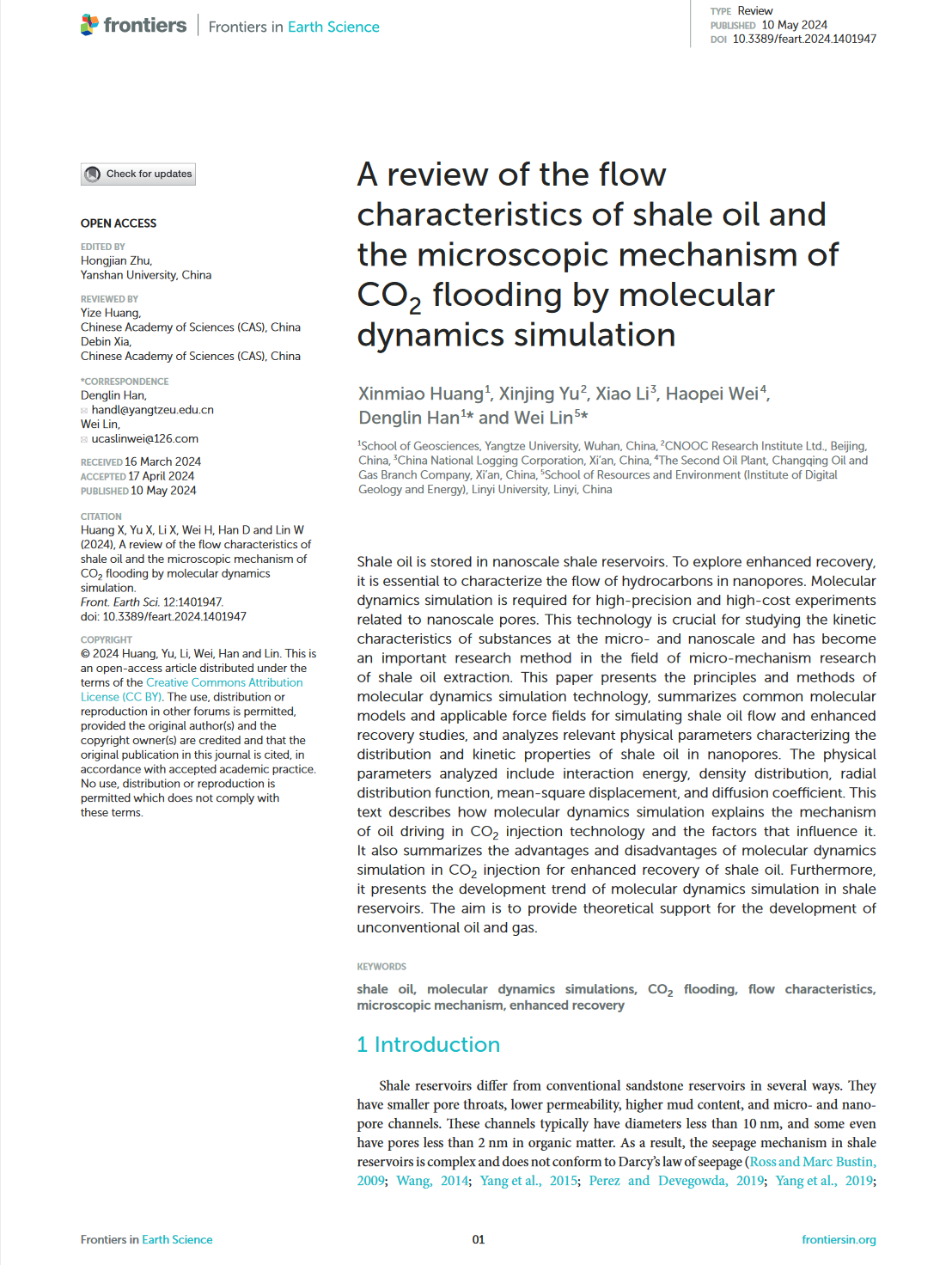 太阳成集团122ccvip硕士研究生黄鑫淼在《Frontiers in Earth Science》发表了题为“A review of the flow characteristics of shale oil and the microscopic mechanism of CO2 flooding by molecular dynamics simulation”的综述论文,太阳成集团122ccvip为论文第一署名单位,黄鑫淼为论文第一作者,韩登林教授、林伟老师共同为该文通讯作者。