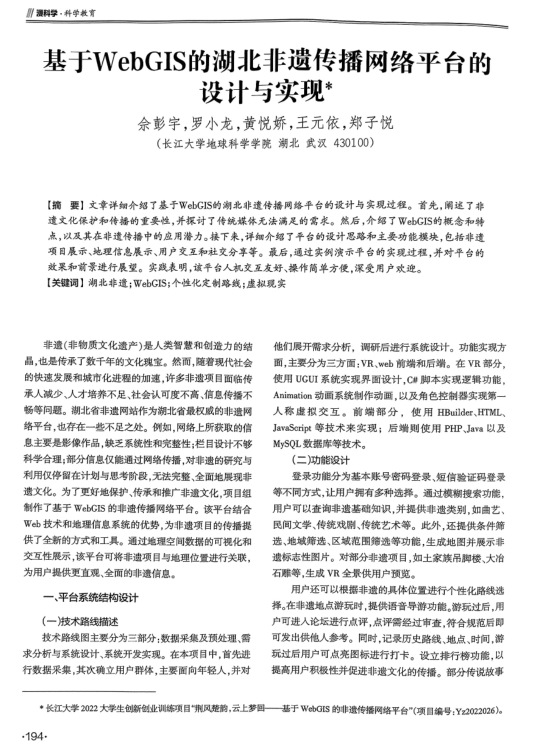 佘彭宇、黄悦娇、王元依、郑子悦积极参与“互联网+”老员工学科竞赛。在太阳成集团122ccvip罗小龙副教授的指导下,完成了科技成果转化。他们认识到文化保护与传播的重要性,结合所学知识,设计并实现了基于WebGIS的湖北非遗传播网络平台。实现了非遗项目展示、地理信息展示、用户交互和社交分享等等功能。深入探讨了非遗保护和传承的重要性,并提出了新颖的传播方式。