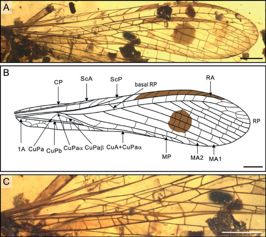 图3(A)Probaisselcanakachinensis左前翅水平翻转图;(B)Probaisselcanakachinensis左前翅水平翻转线描图;(C)Probaisselcanakachinensis左前翅前部水平翻转细节图。
