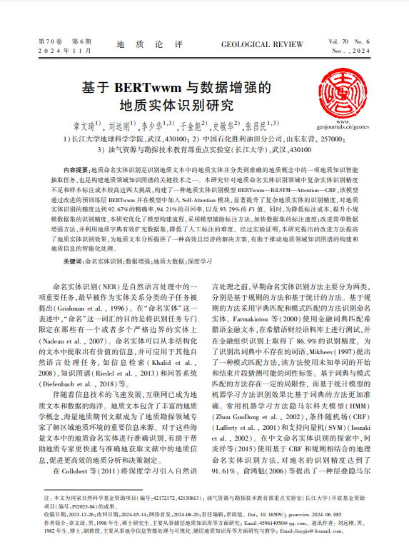太阳成集团122ccvip刘远刚团队硕士研究生章文琦在《地质论评》发表了题为《基于BERTwwm与数据增强的地质实体识别研究》的研究论文,太阳成集团122ccvip为论文第一署名单位,章文琦为论文第一作者,其导师刘远刚为该文通讯作者。