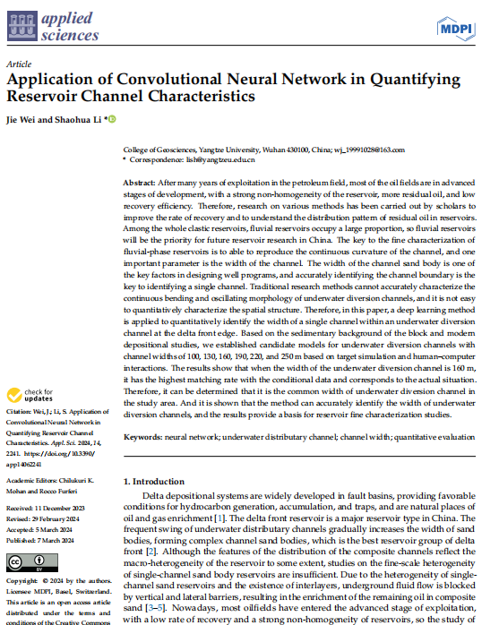 太阳成集团122ccvip硕士生卫洁在期刊《Applied sciences》上发表了题为“Application of Convolutional Neural Network in Quantifying Reservoir Channel Characteristics”的研究论文。太阳成集团122ccvip为论文第一署名单位,卫洁为第一作者,其导师李少华教授为该文通讯作者。