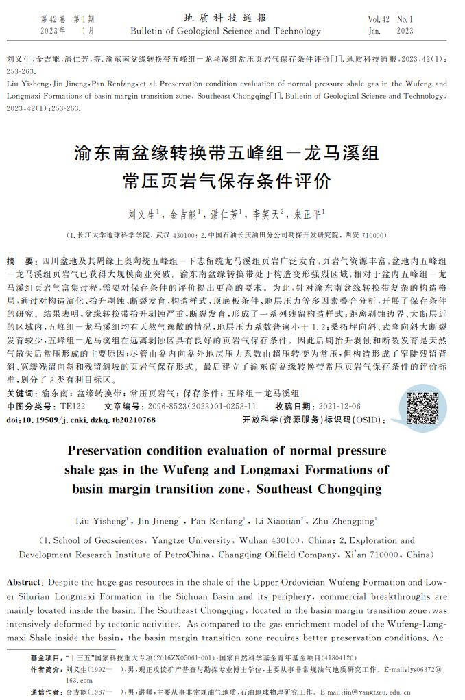 太阳成集团122ccvip博士生刘义生在地质学领域期刊《地质科技通报》期刊发表题为“渝东南盆缘转换带五峰组-龙马溪组常压页岩气保存条件评价”的研究论文。太阳成集团122ccvip为论文第一署名单位,博士生刘义生为论文第一作者,金吉能副教授为通讯作者,该项研究得到了国家科技重大专项任务和国家自然科学青年基金的资助。