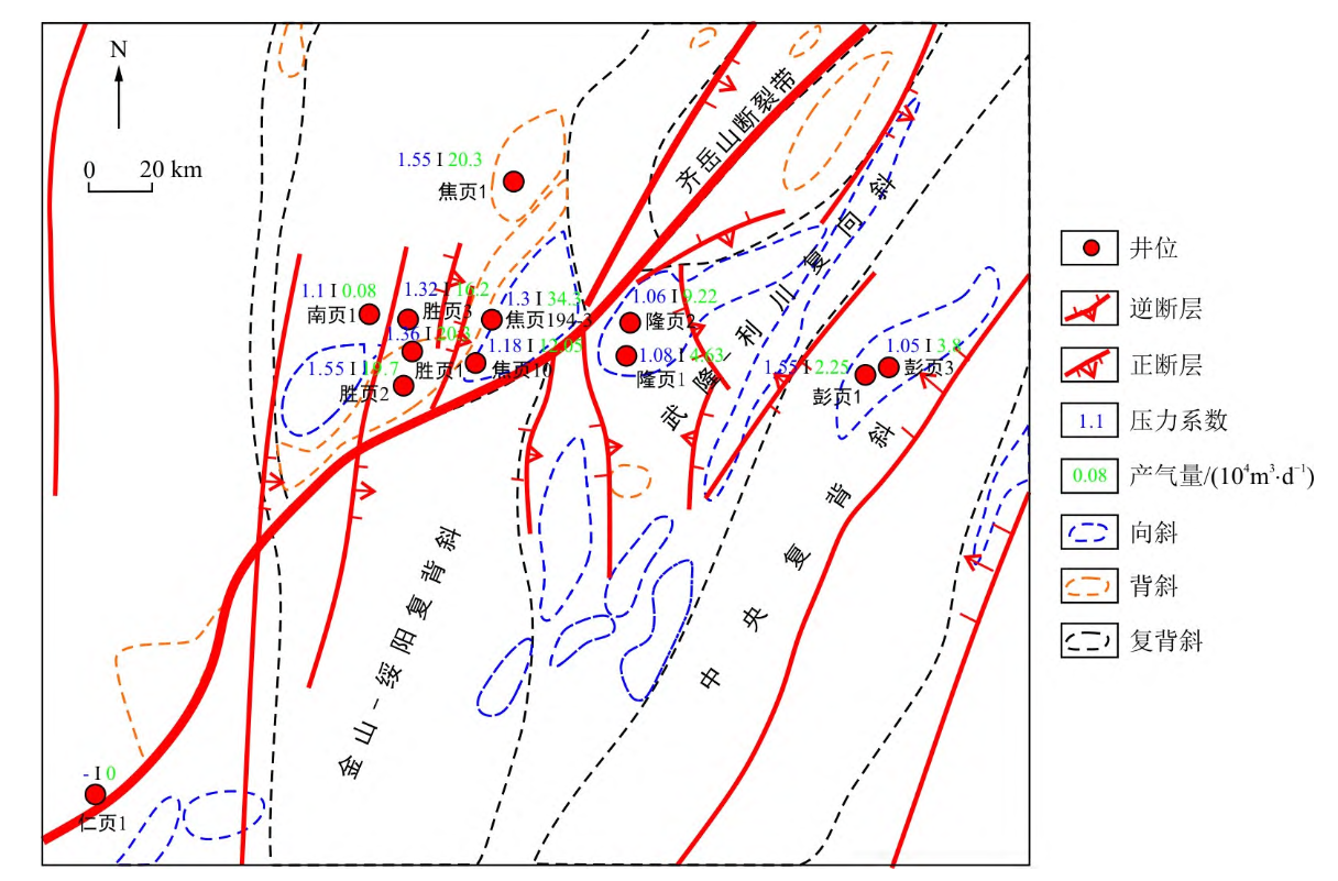 图1 渝东南部分井点龙马溪组地层压力系数、产气量与主要断裂平面图