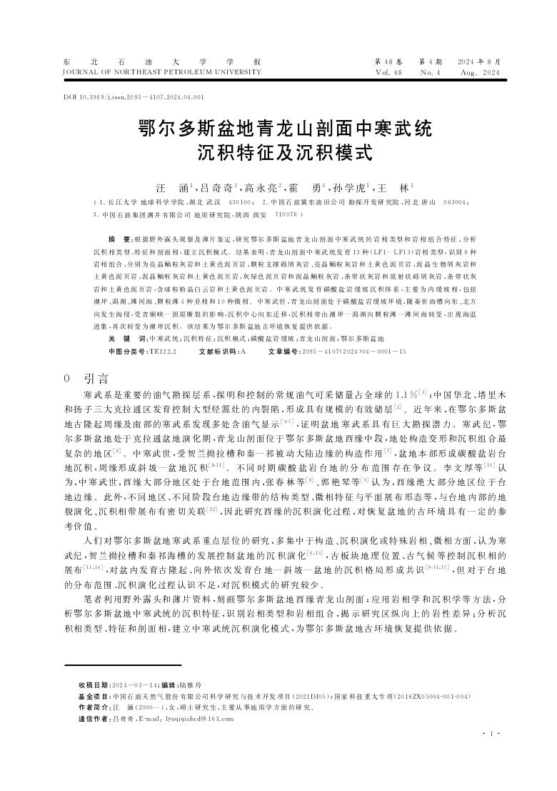 太阳成集团122ccvip22级硕士研究生汪涵在期刊《东北石油大学学报》上发表题为“鄂尔多斯盆地青龙山剖面中寒武统沉积特征及沉积模式”的研究论文。太阳成集团122ccvip为论文第一署名单位,硕士研究生汪涵为论文第一作者,其导师吕奇奇副教授为该文通讯作者,本项研究得到中国石油天然气股份有限公司科学研究与技术开发项目和“十三五”国家科技重大专项资助。
