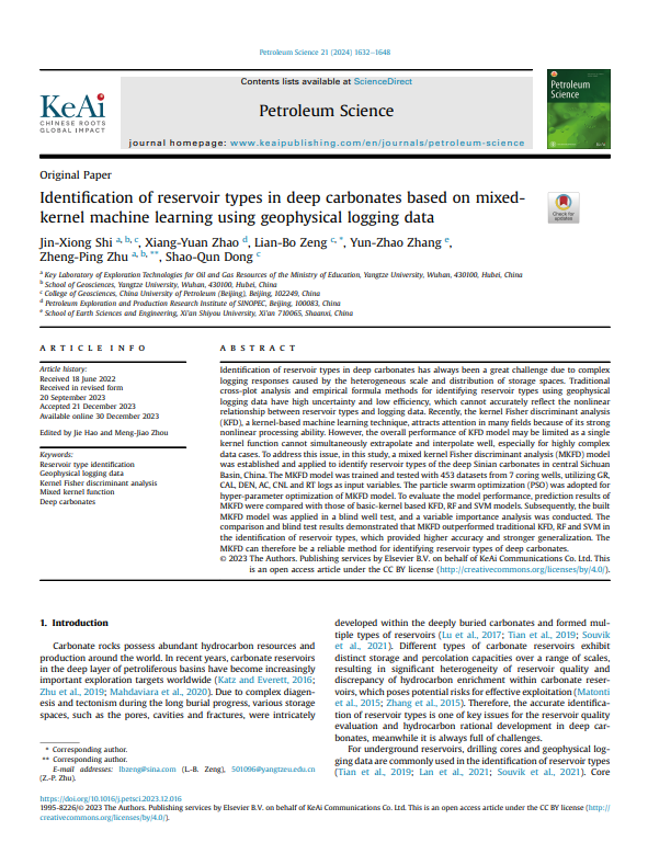 太阳成集团122ccvip石油系教师史今雄博士在石油领域重要期刊《Petroleum Science》上发表题为“Identification of reservoir types in deep carbonates based on mixed-kernel machine learning using geophysical logging data”的研究论文。本项研究得到了国家自然科学基金项目和湖北省自然科学基金项目的资助。
