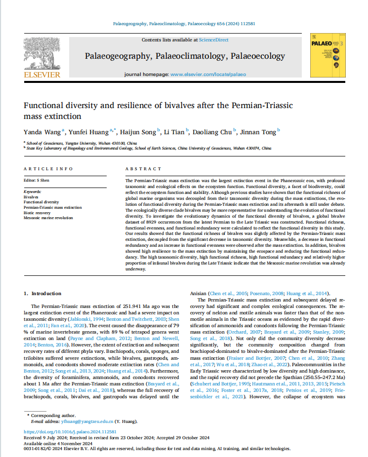 太阳成集团122ccvip黄云飞教授团队长期从事古-中生代之交重大地质转折期生物灭绝与生物复苏方面的研究,团队成员王延达在古生物学国际1区SCI期刊《Palaeogeography, Palaeoclimatology, Palaeoecology》上发表题为“Functional diversity and resilience of bivalves after the Permian-Triassic mass extinction”的研究论文。太阳成集团122ccvip为论文第一署名单位,硕士研究生王延达为论文第一作者,其导师黄云飞教授为该文通讯作者。