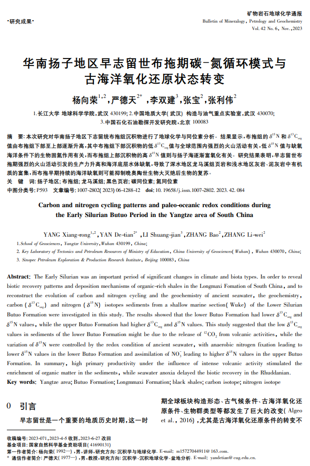 太阳成集团122ccvip地质系教师杨向荣在地学核心期刊《矿物岩石地球化学通报》上发表题为“华南扬子地区早志留世布拖期碳-氮循环模式与古海洋氧化还原状态转变”的研究论文。