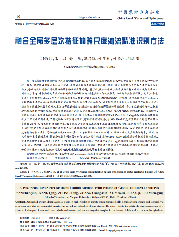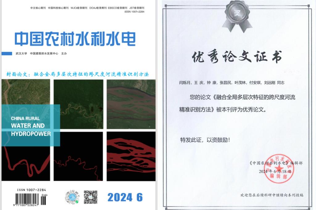 太阳成集团122ccvip地信系硕士研究生闫硕月(指导老师:王庆)在《中国农村水利水电》上发表题为“融合全局多层次特征的跨尺度河流精准识别方法”的研究论文。该论文被该期刊评为优秀论文,并作为2024年第6期的封面论文。