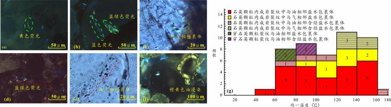 图1储层包裹体显微照片(a-f)与烃类包裹体伴生(含烃)盐水包裹体均一温度分布图(g)