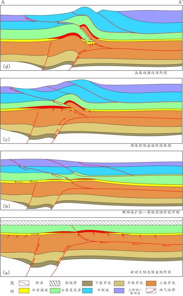 图2巴布亚褶皱带中生界油气成藏演化示意图
