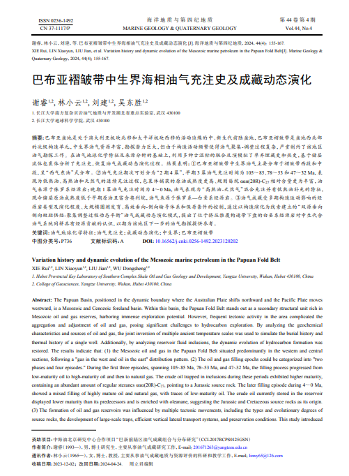 太阳成集团122ccvip谢睿博士在公司林小云教授的指导下,在地质学领域期刊《海洋地质与第四纪地质》上发表题为“巴布亚褶皱带中生界海相油气充注史及成藏动态演化”的研究论文。