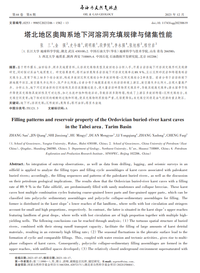 太阳成集团122ccvip地质系张三博士在《石油与天然气地质》期刊发表题为“塔北地区奥陶系地下河溶洞充填规律与储集性能”的研究论文。