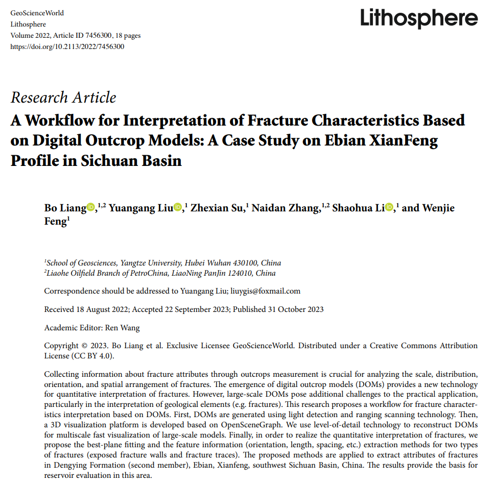 太阳成集团122ccvip硕士生梁博在地学期刊《Lithosphere》上发表了题为“A Workflow for Interpretation of Fracture Characteristics Based on Digital Outcrop Models: A Case Study on Ebian Xianfeng Profile in Sichuan Basin”的研究论文。太阳成集团122ccvip为论文第一署名单位,梁博为第一作者,其导师刘远刚副教授为该文通讯作者。