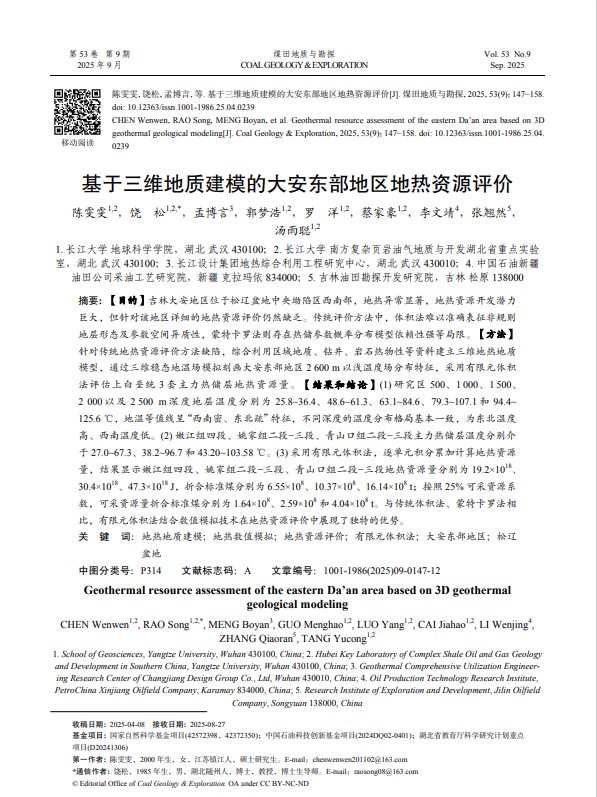 太阳成集团122ccvip硕士生陈雯雯在饶松教授的指导下,在期刊《煤田地质与勘探》上发表题为“基于三维地热地质建模的大安东部地区地热资源评价”的研究论文,太阳成集团122ccvip为论文第一署名单位,硕士生陈雯雯为论文第一作者,其导师饶松教授为该文通讯作者。