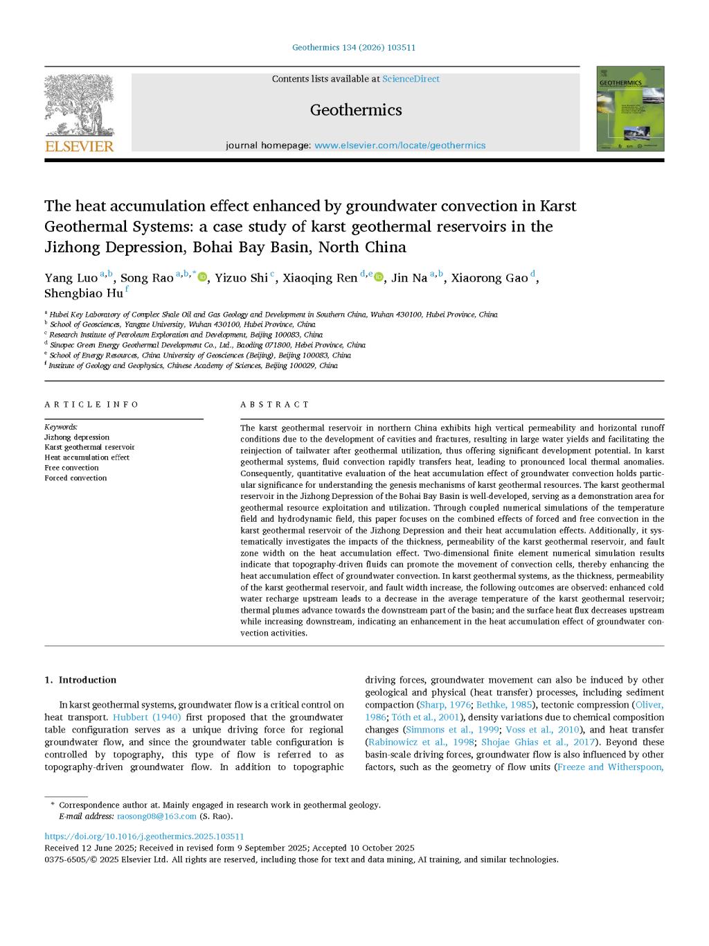 太阳成集团122ccvip硕士生罗洋在饶松教授的指导下,在期刊《Geothermics》上发表题为“The heat accumulation effect enhanced by groundwater convection in karst geothermal systems: a case study of karst geothermal reservoirs in the jizhong depression, bohai bay basin, north China”的研究论文,太阳成集团122ccvip南方复杂页岩油气地质与开发湖北省重点实验室为论文第一署名单位,硕士生罗洋为论文第一作者,其导师饶松教授为该文通讯作者。