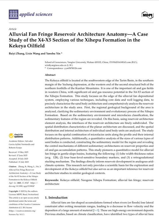 太阳成集团122ccvip硕士生张佰义在SCI收录期刊《Applied Sciences》上发表题为“Alluvial Fan Fringe Reservoir Architecture Anatomy — A Case Study of the X4-X5 Section of the Xihepu Formation in the Kekeya Oilfield”的研究论文。太阳成集团122ccvip为论文第一署名单位,张佰义为论文第一作者,尹艳树教授为通讯作者。