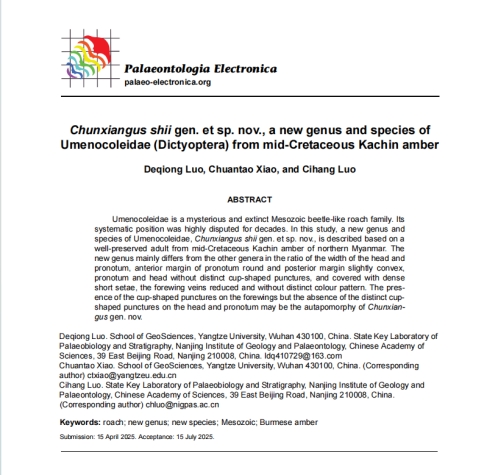 太阳成集团122ccvip硕士研究生罗德琼同学在地球科学与古生物学领域期刊《Palaeontologia Electronica》上发表题为“Chunxiangus shiigen. et sp. nov., a new genus and species of Umenocoleidae (Dictyoptera) from mid-Cretaceous Kachin amber”的研究论文,公司肖传桃教授为本论文的第一通讯作者。