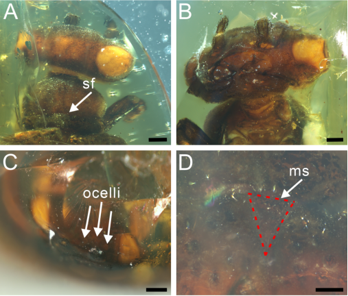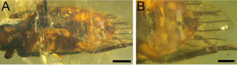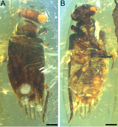 该研究选取了白垩纪中期克钦琥珀中保存相对完好的标本为研究对象,该块标本产自缅甸克钦地区胡康河谷地区。根据对该标本进行认真详细的镜下观察与描述对比,确定其为奇翅目玉门鞘螊科新属新种,定名为Chunxiangus shii。该新属和该科其它属的区别主要在于头部和前胸背板的长宽比、前胸背板前缘圆润而后缘微凸、前胸背板和头部无明显的杯状凹陷且覆盖了密集的短刚毛、前翅脉序退化且无明显的颜色图案。Chunxiangus shii可能是典型玉门鞘蠊(如Umenocoleus、Enervipraeala、Laticephalana)与更接近蜚蠊形态的玉门鞘蠊(如Alienopterix)之间的过渡类群。