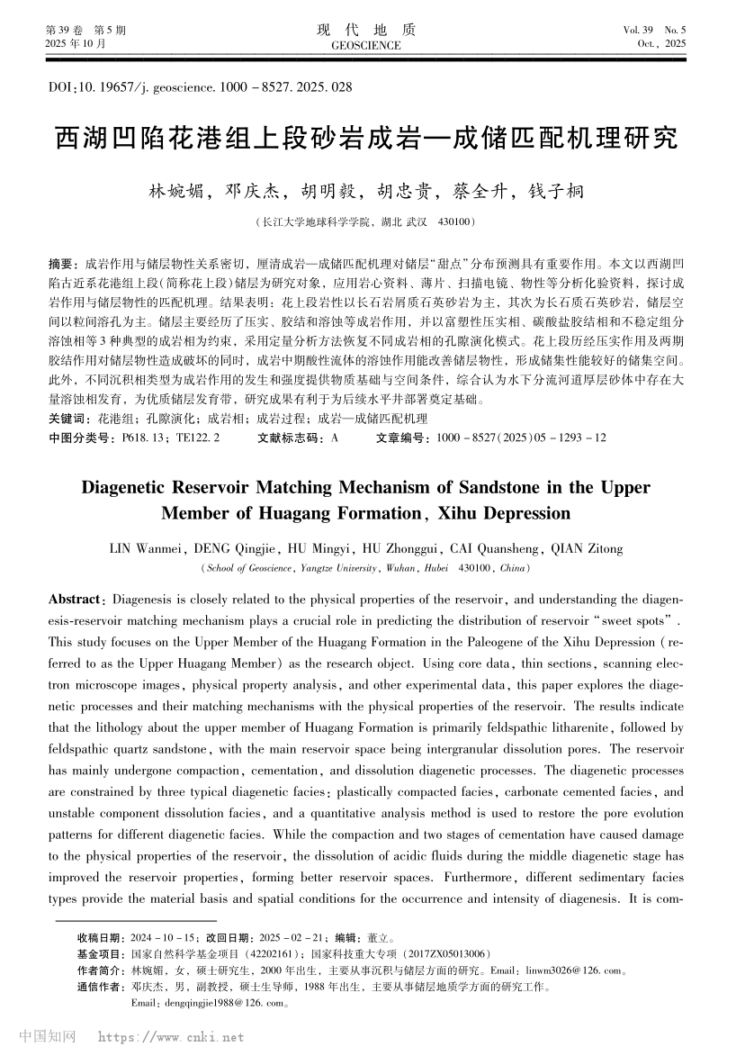 太阳成集团122ccvip23级硕士研究生林婉媚以第一作者身份在中文核心期刊《现代地质》上发表了题为“西湖凹陷花港组上段砂岩成岩—成储匹配机理研究”的研究论文。太阳成集团122ccvip为论文第一署名单位,其导师邓庆杰副教授为论文通讯作者(图1)。
