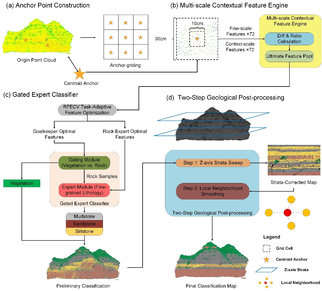 针对 TLS 点云在细粒岩性识别中受风化噪声影响大、岩性差异细微且易发生特征混叠的难题,研究团队利用多尺度特征构建、跨尺度对比增强和任务分解式分类等技术手段,开发了 MC-H-Geo 精细岩性智能识别方法。该方法在陕西前王家河露头开展应用与验证,系统评估其在泥岩、粉砂岩和细砂岩等近似岩性区间的判别能力。结果表明,MC-H-Geo 的总体精度达到 94.3%,Macro F1 为 0.944,显著优于 PointNet++、SG-RFGeo 等基线模型,并有效改善岩性边界模糊与薄层识别不足的问题。研究成果在复杂地质露头场景中的岩性识别效果与现有方法相比具有比较明显的优势。