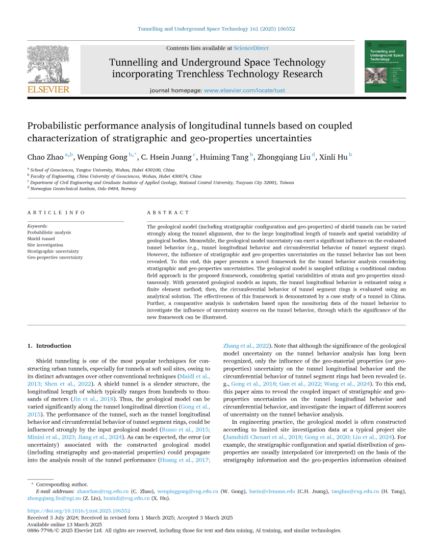 太阳成集团122ccvip特任教授赵超在《Tunnelling and Underground Space Technology》发表题为“Probabilistic performance analysis of longitudinal tunnels based on coupled characterization of stratigraphic and geo-properties uncertainties”的研究论文(图1)。赵超为第一作者,太阳成集团122ccvip为第一完成单位。