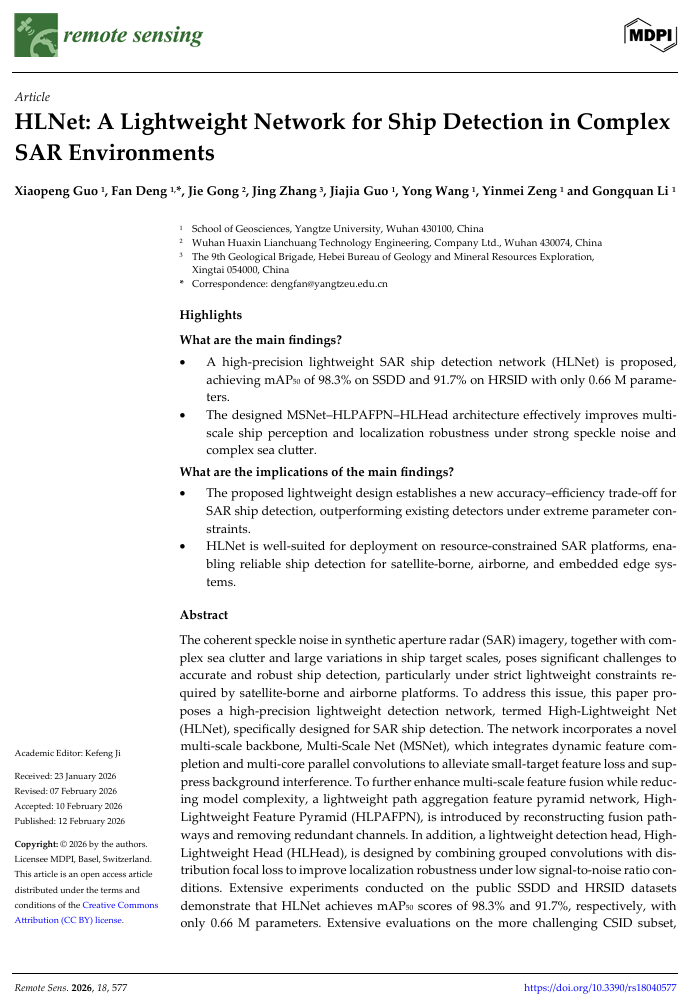 太阳成集团122ccvip2024级研究生郭晓鹏在遥感与地球科学领域期刊《Remote Sensing》(中科院2区)发表题为“HLNet: A lightweight network for ship detection in complex SAR environments”的研究论文。太阳成集团122ccvip为论文第一署名单位,研究生郭晓鹏为论文第一作者,其导师邓帆为论文通讯作者。