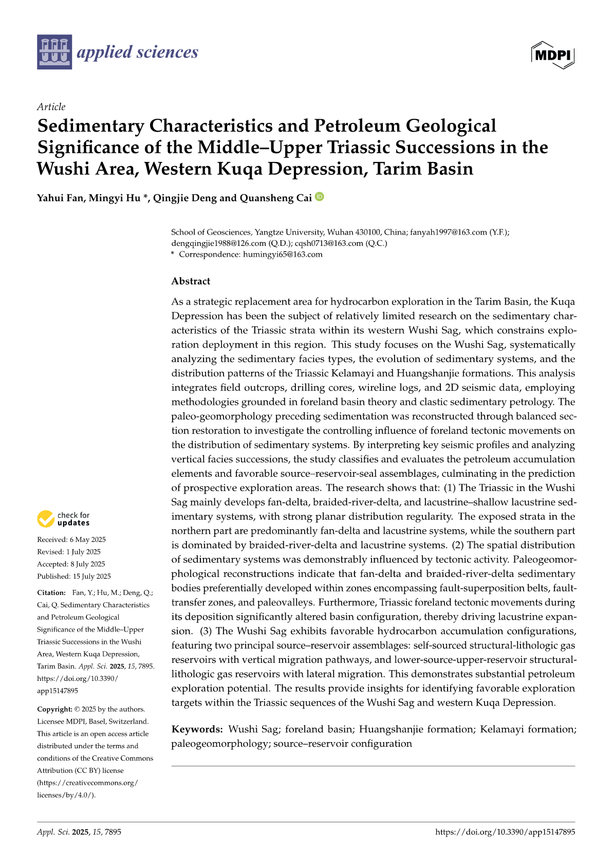 太阳成集团122ccvip硕士生范亚辉在SCI收录期刊《Applied Sciences》上发表题为“Sedimentary Characteristics and Petroleum Geological Significance of the Middle–Upper Triassic Successions in the Wushi Area, Western Kuqa Depression, Tarim Basin”的研究论文。太阳成集团122ccvip为论文第一署名单位,胡明毅教授为通讯作者。