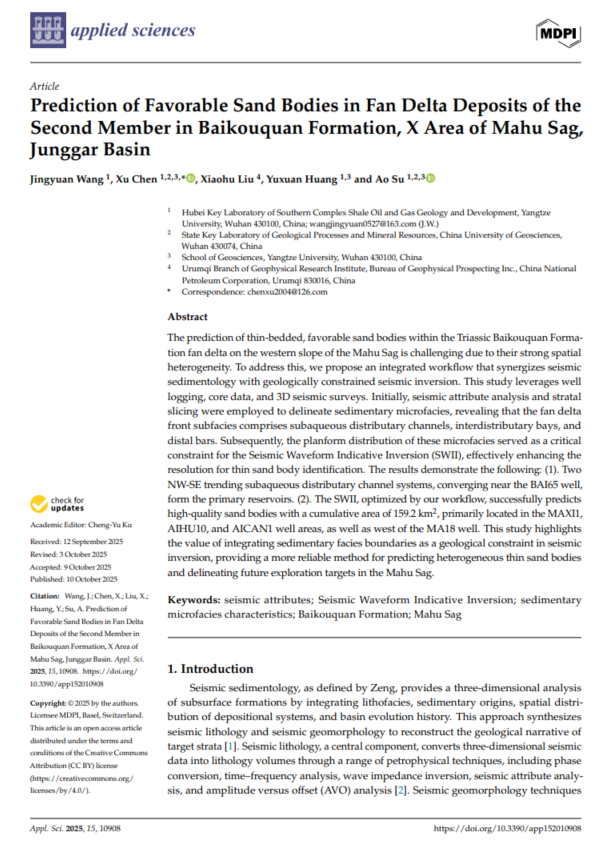 论文链接:Prediction of favorable sand bodies in fan delta deposits of thesecond member in Baikouquan Formation, X Area of Mahu Sag,Junggar Basin