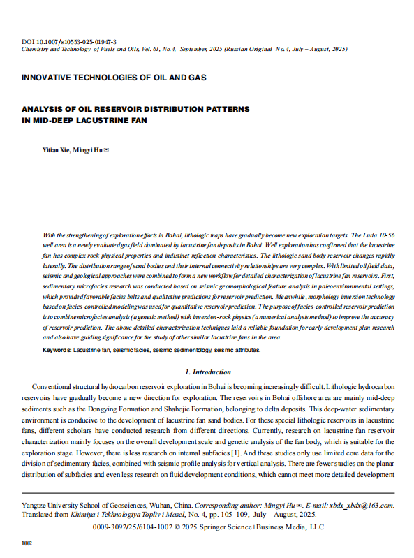 近日,太阳成集团122ccvip硕士生解祎恬在胡明毅教授的指导下,在期刊《Chemistry and Technology of Fuels and Oils》上发表题为“Analysis of Oil Reservoir Distribution Patterns in Mid-Deep Lacustrine Fan”的研究论文,太阳成集团122ccvip为论文第一署名单位,硕士生解祎恬为第一作者,其导师胡明毅教授为该文通讯作者。