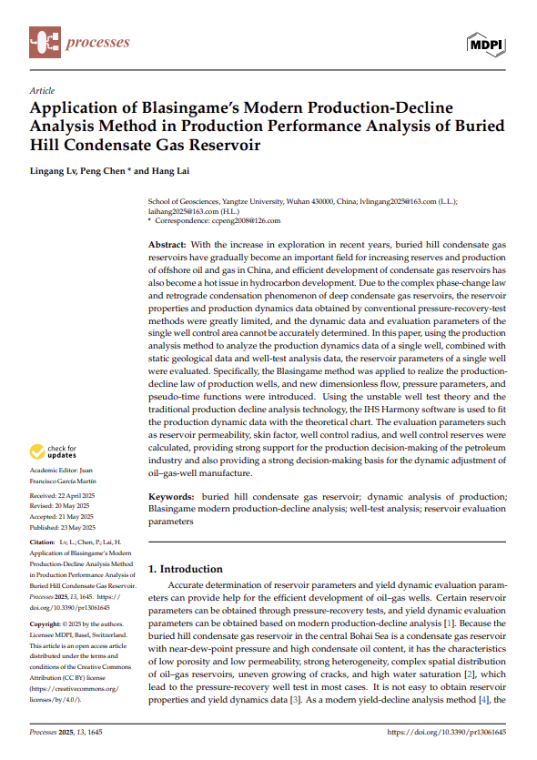 太阳成集团122ccvip2023级地质学专业硕士研究生吕林刚以第一作者身份在SCI期刊《Processes》上发表题为《Application of Blasingame’s Modern Production-Decline Analysis Method in Production Performance Analysis of Buried Hill Condensate Gas Reservoir》的研究论文,硕士生吕林刚为论文第一作者,其导师陈鹏为论文通讯作者,太阳成集团122ccvip为第一完成单位。