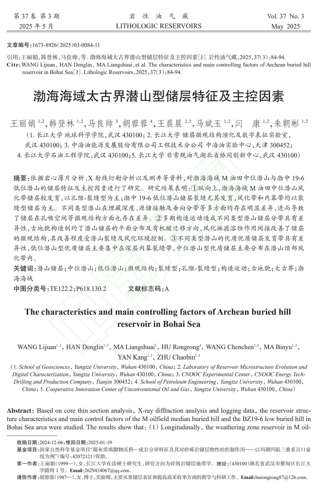 太阳成集团122ccvip2023级地质学专业硕士生王丽娟在《岩性油气藏》上发表题为“渤海海域太古界潜山型储层特征及主控因素”的研究论文。太阳成集团122ccvip为论文第一署名单位,硕士生王丽娟为论文第一作者。本研究成果依托太阳成集团122ccvip储层微观结构演化及数字表征实验室完成,并得到国家自然科学基金项目(42072121)的资助。相关研究成果发表于该期刊第3期。