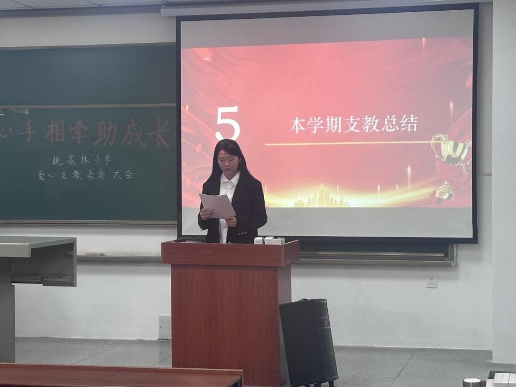 颁奖结束后员工会成员王誉晗对上学年支教活动进行总结,分享在过去一年组织支教活动过程中的收获,代表部门全体成员感谢大家对活动的支持,同时宣布本学年支教活动开启,号召大家继续积极参与支教活动。