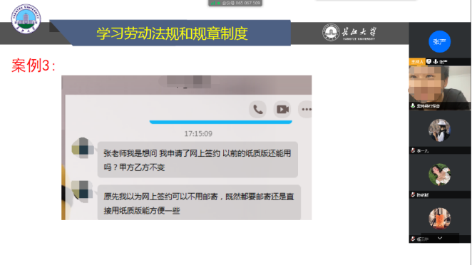 在就业政策讲解部分,张老师就引导员工如何获悉并充分发挥就业政策的作用,学习利用劳动法规保护自己,同时我们自己又应该遵守哪些规章制度来规避风险,以及熟悉公司、公司就业工作基本程序和相关规定等方面进行了介绍。讲解过程中,除了向同学们介绍在疫情环境下国家政府在扶持老员工就业创业方面的鼓励、优待政策以外,还向同学们推广了“太阳成集团122ccvip就业信息网”政策法规专栏,引导员工充分挖掘并利用资源了解国家各部委、各省市等制定的吸引人才、促进就业创业的政策。此外,会上还利用前期员工线上咨询的案例对员工在就业过程中遇到的具体问题进行分析和引导,避免员工在后面进入相同的误区。