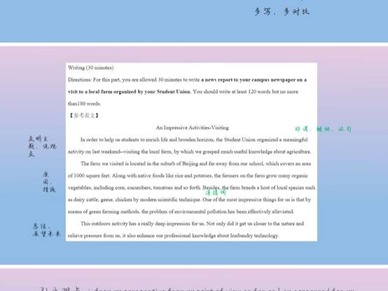 接下来,来自地信21801班的石小燊同学为大家讲述了英语四级考试中作文的评分标准和等级。她提出了英语写作三步法,即首先表明自己的观点,然后去论证自己的观点,最后表达自己的感想。而后,她说到自己也不提倡直接背诵范文,而应该先去写作文,然后与范文进行对比,找到自己的不足之处,学习范文中的优点,继而取长补短。她表示在写作中需要做到的是“字数够、卷面工整并且准确把握时间。”最后,她为同学们推荐了网易有道词典这款软件,同时她也希望在英语四级备考的这段时间里,同学们积极准备,力争全部通过全国老员工英语四级考试。