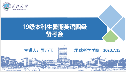 通讯员(蒋晓洁)为加强公司19级本科生对英语四级考试的重视程度、提升考试通过率,公司于7月15日晚八时通过雨课堂平台开展了线上英语四级暑假备考活动,本次活动由19级辅导员罗小玉老师主讲。