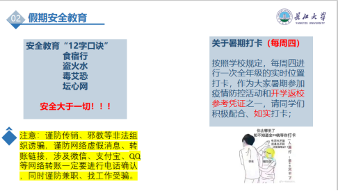 会议伊始,辅导员先就暑期安全教育工作进行了强调,传达了公司关于暑期的工作安排及秋季开学时间等内容。紧接着,罗老师从“返荆返汉不返校”、“异地流动”和“安全教育12字口诀”三方面展开了安全教育,在确保员工及时报备地域流动情况的同时,还提醒同学们要注意人身安全及财产安全。