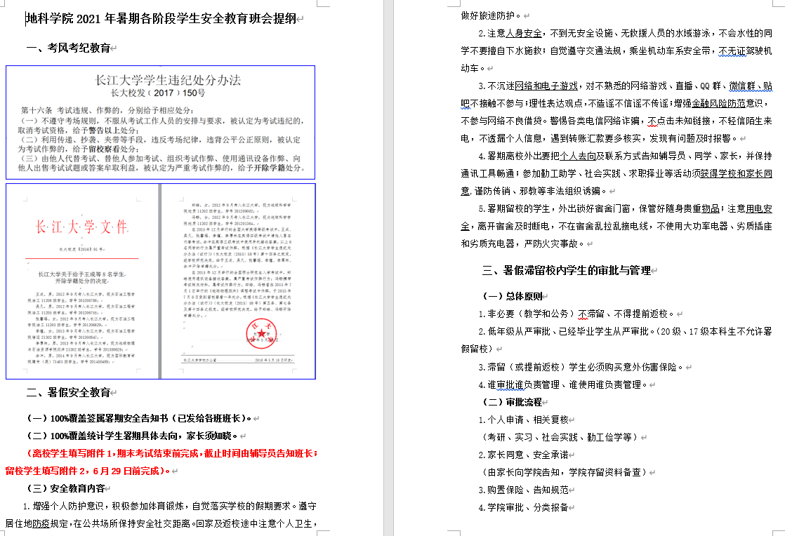 6月23日,学工办全体老师集中对暑期各阶段员工安全教育工作的方方面面进行了梳理,就重难点工作进行了具体安排与分工,并拟定《太阳成集团122ccvip2021年暑期各阶段员工安全教育班会提纲》进一步保证班会效果。6月24日,各辅导员分年级组织召开了班长及安全员会议,重点讲解了安全教育班会的内容,并对如何开好班会及各类资料的收集进行了一一说明。