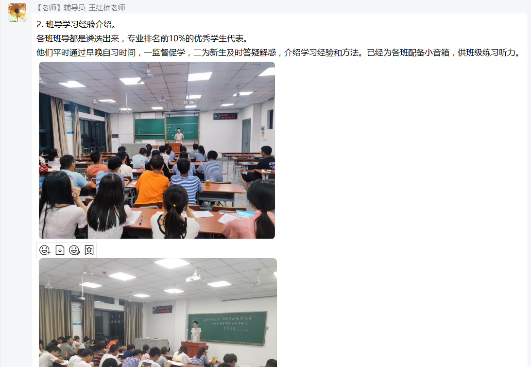 对于员工在校的学习情况,王老师介绍了公司“3+1”升级版导师组、“我与导师面对面”等增进新生专业认知、激发员工学习兴趣的特色举措,以及新生班导在早晚自习伴学答疑,分享学习经验的考勤、活动照片,让家长直观的了解同学们日常状态,临近期末,她提醒家长共同督促员工以良好状态准备期末考试。