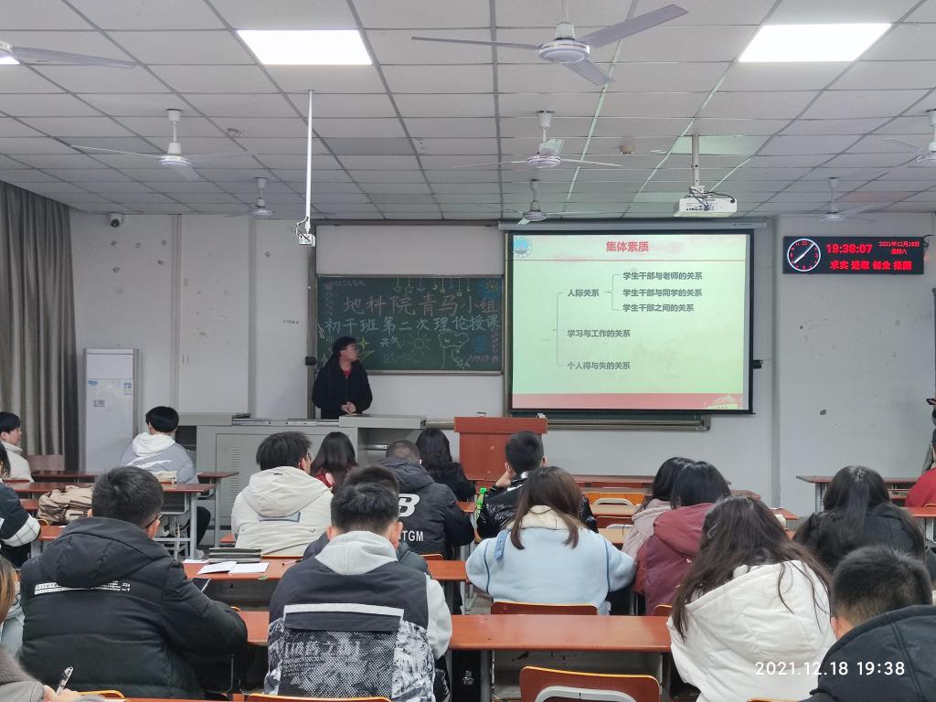 本次授课由本次授课共分为三个部分。首先是地信(测绘)21902班的王高寒为同学们讲解“员工干部应具备的能力和素养”。他从原因、思想、知识素养、责任心和大局观念、行动能力、沟通能力这六个方面展开,告诉同学们如何成为一名合格的员工干部,同时告诫大家,无论何时都不能轻视自己的学业。