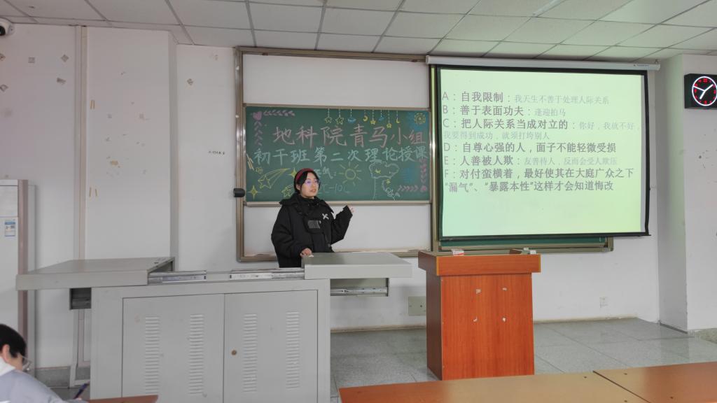 接下来是地质(资源)21901班的高婧为同学们生动形象地讲解“员工干部应学会处理的关系和持有的态度”。事事洞明皆学问,人情练达即文章。作为员工干部,学会处理人际关系这项技能至关重要。高婧同学从需要改进的问题、需妥善处理的几种关系这两个方面展开。其中,她重点讲解了需妥善处理的几种关系,包括上下级、同级、员工会和班级、务实与务虚、自己与老师这五个方面。高婧同学鞭辟入里地分析了员工干部处理人际关系时存在的问题,全面涵盖人际关系之间的通病,为同学们提供自己的经验和做法。