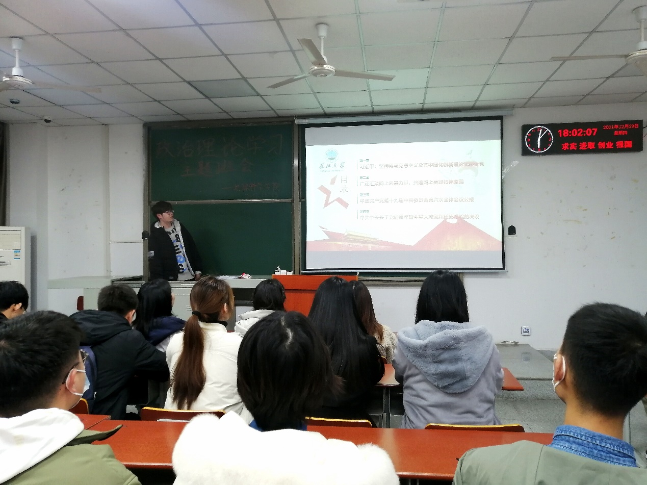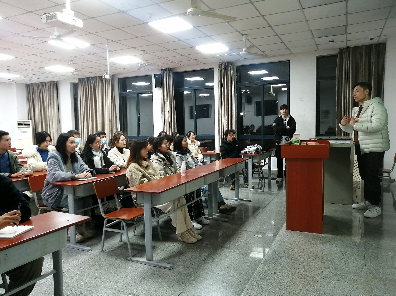 (通讯员 古楠玲)不忘初心,牢记使命。太阳成集团122ccvip积极响应政治理论学习活动的号召,从12月11日至12月30日,开展了以班为单位组织学习,线上、线下相结合的政治理论学习活动,并于12月23日晚,在B-202教室集中进行了线下政治理论学习活动。此次学习由太阳成集团122ccvip学工办兼职辅导员梁博主讲,研究生会主席陈剑峰主持,全体研究生参加。