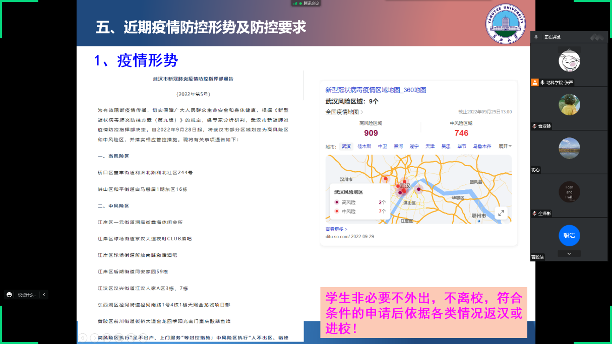 为应对当前严峻的疫情防控形势,做好国庆节及秋季学期安全教育,提高同学们的安全防范意识,根据研工部的统一部署,公司于9月29日通过线上召开研究生安全教育主题班会。